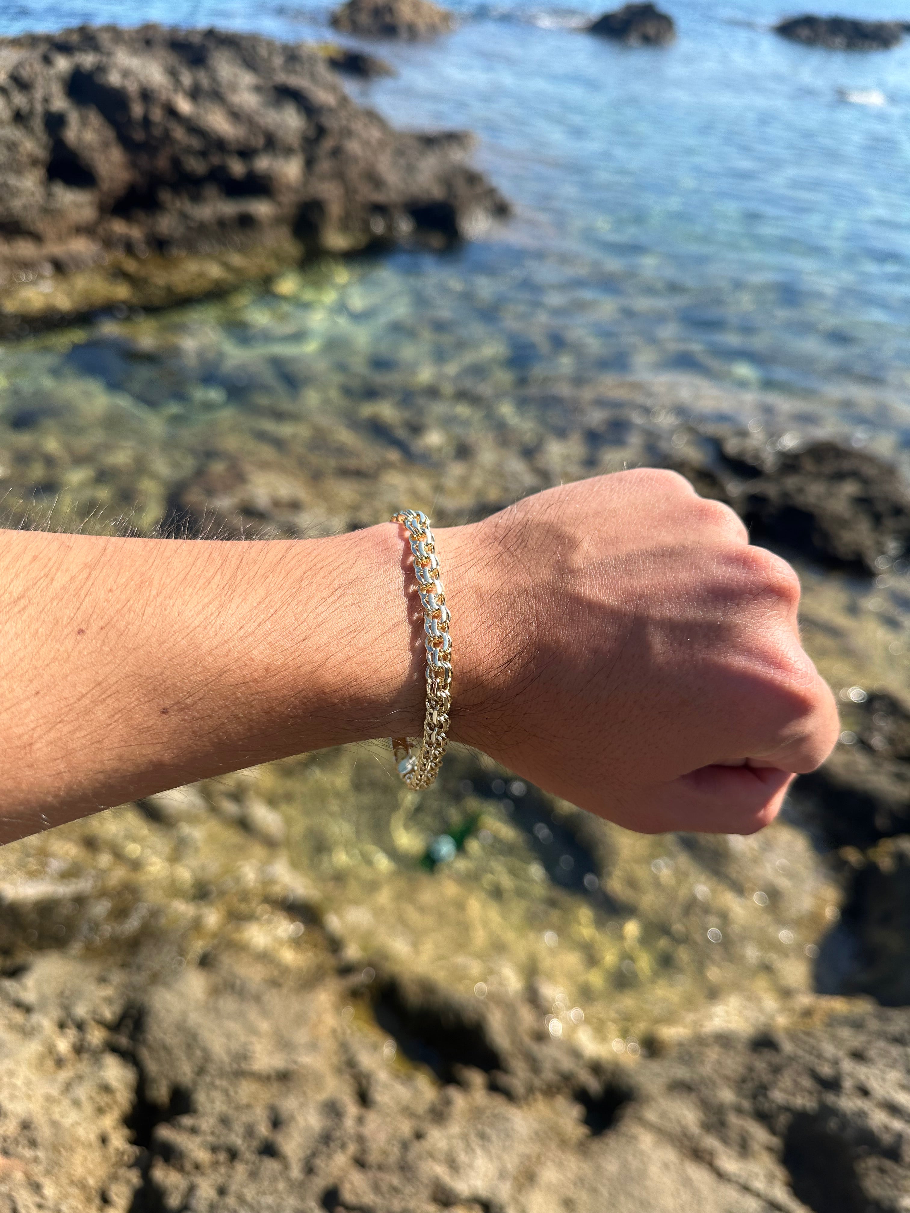 Si quieres relucir ante los demás, te recomendamos esta pulsera. Brilla como oro real, te impresionarás al ver la calidad. Es una de nuestras pulseras de oro laminado más vendidas. Nos hemos metido al mar y a la alberca con ella, y no le ha pasado nada, sigue manteniendo el color. Sin embargo; recomendamos a nuestros clientes que no la metan tanto al agua, para que siga permaneciendo el color y brillo, y te dure más. Si la cuidas bien, te puede durar hasta años. 100 % recomendada.